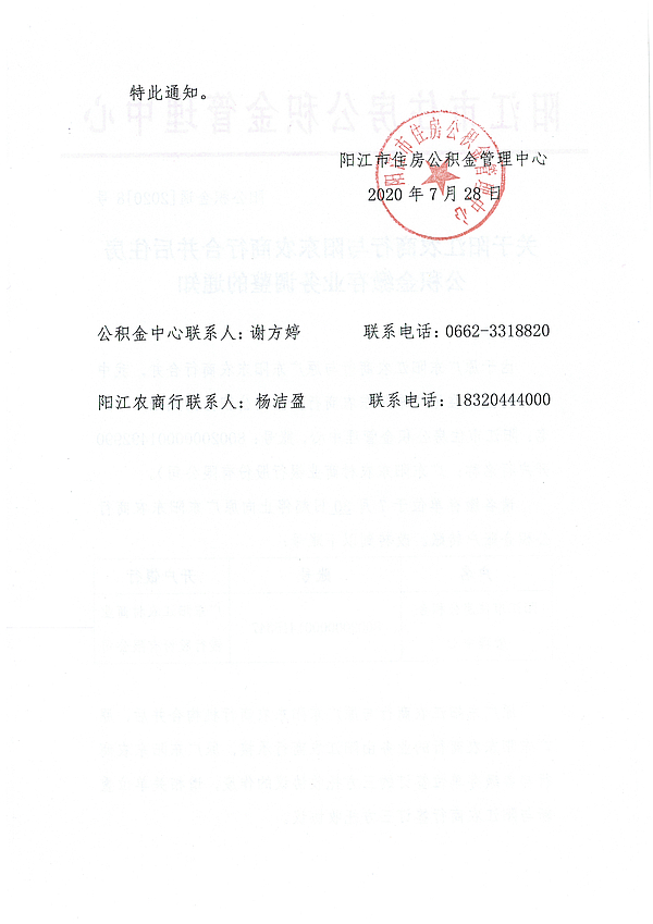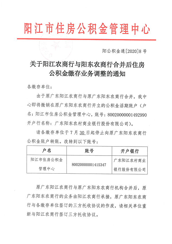 關(guān)于陽江農(nóng)商行與陽東農(nóng)商行合并后住房公積金繳存業(yè)務(wù)調(diào)整的通知